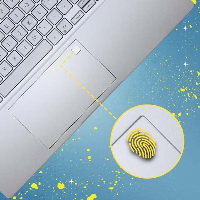 Asus Vivobook 14X OLED laptop with integrated fingerprint sensor at the touchpad and Windows Hello, you don't have to type in your password every time you log in – just one touch to wake up!